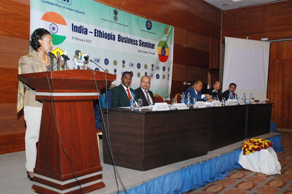 Mrs. Hirut Zemene, State Minister of Foreign Affairs addressing the India-Ethiopia Business Seminar in Addis Ababa