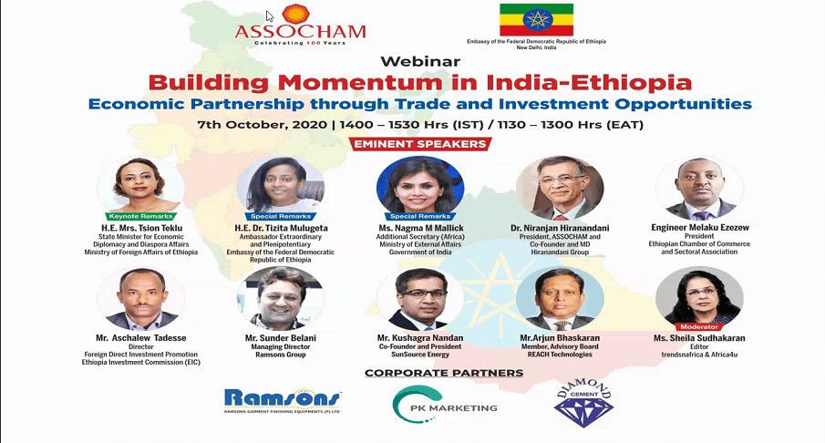 The Associated Chambers of Commerce and Industry of India (ASSOCHAM) facilitated a special webinar on 7 October 2020 on building momentum in India-Ethiopia Economic Partnership through Trade and Investment Opportunities to provide a fresh impetus to the robust India-Ethiopia partnership.